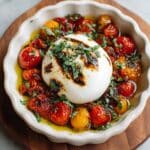 - Prepare Burrata Platter: While the tomatoes roast, arrange the burrata cheese in the center of a serving platter, ready for the warm topping.