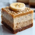 A square dessert bar with three visible layers: the bottom layer is dark brown and slightly crumbly, the middle layer is a dense, light beige with fine texture and some darker specks, and the top layer is a smooth, light brown frosting with a slightly glossy finish. The dessert is topped with a thick round slice of pale yellow banana placed in the center. The dessert is positioned on a white marbled surface, with a blurred second piece in the background. photo taken with an iphone --ar 4:5 --v 7