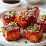 This image shows a white plate filled with eight pieces of glazed salmon, each cut into thick, square-shaped chunks. The salmon has a shiny, caramelized orange-brown surface with a slightly charred texture, topped with small white sesame seeds and chopped green onion pieces scattered evenly across the fish. The background shows a white marbled surface with two white bowls of dark and reddish dipping sauces slightly blurred. photo taken with an iphone --ar 4:5 --v 7