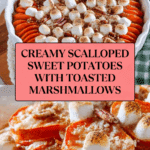 Keywords: scalloped sweet potatoes, baked sweet potatoes, holiday side dish, sweet potato casserole, marshmallow topping, pecans, comforting side