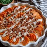 This Best Scalloped Sweet Potatoes recipe features thinly sliced sweet potatoes baked in a rich brown sugar and cream sauce, flavored with warm cinnamon, nutmeg, and vanilla. Topped optionally with gooey mini marshmallows, this comforting casserole makes a perfect sweet side dish for holidays or cozy dinners.
