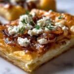 - Assemble the Tarts: While onions cool slightly, roll out puff pastry on a lightly floured surface. Cut the pastry into 6 rectangles. Spread caramelized onions evenly over each piece, leaving a small border around the edges. Crumble goat cheese generously over the onions and sprinkle a little extra thyme on top for garnish.