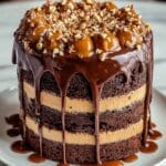Keywords: Chocolate cake, caramel sauce, toffee crunch, dessert, chocolate dessert, layered cake, chocolate caramel cake, easy chocolate cake