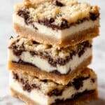 Indulge in rich, decadent Chocolate Chip Cheesecake Bars featuring a buttery graham cracker crust, a smooth and creamy cheesecake layer, and a luscious chocolate chip cookie dough topping. Perfectly baked to golden perfection, these bars combine the best elements of cheesecake and cookie dough into one irresistible dessert.