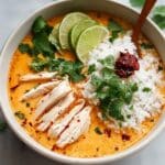 Coconut Chicken Brothy Rice is a comforting one-pot meal featuring tender boneless chicken thighs simmered in a fragrant coconut and chicken broth infused with garlic, ginger, curry, and turmeric. Served over jasmine rice and garnished with fresh cilantro, green onions, and lime wedges, this dish delivers a delightful balance of creamy, spicy, and tangy flavors perfect for a cozy meal.
