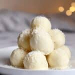Keywords: coconut truffles, no bake dessert, white chocolate truffles, coconut balls, easy sweets
