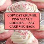 This Copycat Crumbl Pink Velvet Cookies recipe uses a simple cake mix hack to create soft, thick, bakery-style cookies with a rich cream cheese frosting. Featuring a tender pink dough and a creamy, sweet icing, these cookies capture the iconic flavor and texture of Crumbl’s popular treat.