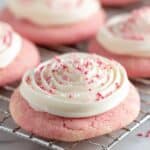 Keywords: Crumbl cookies, pink velvet cookies, cake mix cookies, cream cheese frosting, copycat recipe, soft cookies, bakery style cookies
