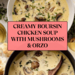 Keywords: Boursin chicken soup, creamy chicken soup, mushroom chicken soup, comfort soup, easy chicken soup, orzo chicken soup