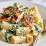 - Combine Pasta, Chicken, and Sauce: Return the cooked chicken to the skillet and add the drained pasta and optional baby spinach. Toss everything thoroughly to ensure the pasta and chicken are evenly coated with the creamy pesto sauce.