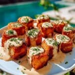 Crispy Bang Bang Salmon Bites are deliciously crunchy salmon cubes coated in a flavorful spiced panko crust, fried to golden perfection, and drizzled with a creamy, tangy, and mildly spicy bang bang sauce. This appetizer is perfect for sharing or serving as a fun, flavorful snack or entrée.