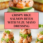 This Crispy Rice Salmon recipe features perfectly seasoned sushi rice pressed into crispy, golden brown rectangles and topped with fresh sushi-grade salmon mixed with a tangy yuzu mayonnaise. Garnished with cucumber slices, toasted sesame seeds, and green onions, this dish delivers a delightful texture contrast and vibrant flavors inspired by Japanese cuisine.