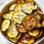 Store leftover zucchini chips in an airtight container at room temperature for up to 2 days. To re-crisp, place them in a low oven (about 200°F / 93°C) for a few minutes until crunchy again. Avoid storing in the fridge as moisture can make them soggy.
