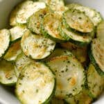 A close-up image of a white bowl filled with several thin, round slices of cooked zucchini. The slices have a light green edge with a slightly darker green peel, and the inner flesh is pale green to white with small specks of green herbs and light golden-brown bits, showing a lightly fried or baked texture. The zucchini slices are layered unevenly, overlapping each other in a casual pile inside the bowl. Photo taken with an iphone --ar 4:5 --v 7
