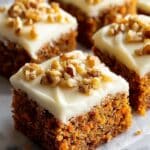 - Frost and Serve: Spread the cream cheese frosting evenly over the cooled carrot cake. Cut into bars of desired size. Optionally, garnish with additional chopped walnuts for extra texture and flavor before serving.