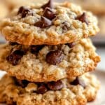 A close-up view of a stack of three oatmeal chocolate chip cookies, each cookie showing a light golden-brown color with a textured surface full of oats and scattered dark chocolate chips embedded throughout; the cookies are piled unevenly on a white plate, highlighting their soft and chewy texture with slightly crisp edges, all set against a white marbled background. photo taken with an iphone --ar 4:5 --v 7