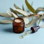 A small dark brown glass jar filled with light beige cream is placed on a smooth light blue surface, beside a black-topped glass dropper containing a small amount of yellow liquid with a drop at the tip. Underneath and around the jar are several large, smooth green eucalyptus leaves with brown stems, adding a natural touch. The scene is simple, clean, and softly lit, focusing on the textures of the glass, cream, and leaves. Photo taken with an iphone --ar 4:5 --v 7