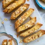 The image shows a group of light golden-brown biscotti sticks topped with thin, toasted almond slices evenly spread on each piece. The biscotti are cut into long rectangular shapes with a slightly crumbly texture and are resting on white parchment paper, placed on a white marbled surface. Some crumbs are scattered around the biscotti, adding a casual, homemade feel. At the side, there is a white plate with a scalloped blue edge holding two biscotti sticks. The overall setting is bright and simple, with natural light highlighting the golden tones and textures of the baked biscotti. photo taken with an iphone --ar 4:5 --v 7