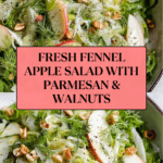 This Easy & Refreshing Fennel Apple Salad combines the crisp textures of thinly sliced fennel and apples with peppery arugula, crunchy walnuts, and shaved Parmesan. Tossed in a simple lemon-olive oil dressing, this bright and flavorful salad is perfect as a light lunch or an elegant side dish that’ll brighten any meal.