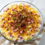 - Add Toppings: Evenly sprinkle the shredded cheddar cheese over the cream cheese layer, followed by the drained crushed pineapple, chopped ham, bacon pieces, and chopped green onions to create a colorful and flavorful topping.