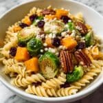 This Fall Harvest Pasta Salad is a colorful, flavorful dish perfect for crisp autumn days. Packed with roasted butternut squash, Brussels sprouts, tart cranberries, and creamy feta, it brings together the best seasonal ingredients in a refreshing pasta salad.