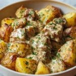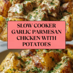 This Garlic Parmesan Chicken Crockpot recipe is a flavorful and comforting slow-cooked meal featuring tender boneless, skinless chicken breasts with baby potatoes, infused with garlic, Parmesan cheese, and Italian seasoning. Perfect for an easy weeknight dinner, it requires minimal prep time and delivers a hearty, cheesy, and savory dish that melts in your mouth.