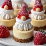 Keywords: mini cheesecakes, gnome cheesecakes, Christmas dessert, no-bake cheesecake, holiday treats, festive desserts, strawberry decoration