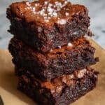 A close-up of three rich, dark chocolate brownies stacked in a pyramid on a piece of light brown parchment paper. Each brownie has a shiny, cracked top crust with coarse white sea salt flakes sprinkled over it, giving a rough texture contrast. The inside layers of the brownies look moist and dense with a gooey, fudgy texture, showing uneven dark brown shades. The background is a white marbled surface, softly blurred to keep focus on the brownies. photo taken with an iphone --ar 4:5 --v 7