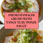 Hamachi Crudo with Yuzu Ponzu Sauce is a fresh, vibrant dish featuring thinly sliced sushi-grade yellowtail dressed in a tangy and aromatic yuzu ponzu dressing. Enhanced with shallots, serrano pepper, fresh cilantro, and lemon zest, this Japanese-inspired appetizer offers a delicate balance of citrus, spice, and umami that delights the palate with every bite.