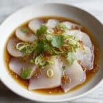 Hamachi Crudo with Yuzu Ponzu Sauce is a fresh, vibrant dish featuring thinly sliced sushi-grade yellowtail dressed in a tangy and aromatic yuzu ponzu dressing. Enhanced with shallots, serrano pepper, fresh cilantro, and lemon zest, this Japanese-inspired appetizer offers a delicate balance of citrus, spice, and umami that delights the palate with every bite.
