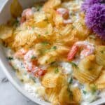 This Hot Lobster Dip is a rich, creamy, and cheesy appetizer featuring langostino lobster blended with cream cheese, mayo, sour cream, and a blend of herbs and cheeses. Baked until bubbly and topped with crunchy crushed potato chips, it’s perfect for entertaining and serving with extra chips and crackers.