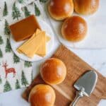 The image shows a group of six golden-brown round bread rolls with a shiny, smooth top crust. Three of the rolls are placed close together on a white marble surface, while the other three are arranged neatly on a light brown wooden cutting board with visible grain patterns. Near the bread rolls, there is a white marble slab holding a block of caramel-colored cheese and three thin, square slices of the same cheese. A silver cheese slicer with a flat, wide blade rests on the marble slab next to the cheese. A cloth with a white background decorated with green pine tree prints and small red animal shapes lies next to the bread rolls and marble slab. The whole scene is set on a white marbled texture surface. photo taken with an iphone --ar 4:5 --v 7