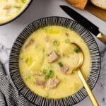 A bowl with a black and white striped rim filled with creamy yellow soup, showing pieces of light brown sausage and chopped green onions floating near the surface. The soup has a smooth texture with small bits of vegetables like pale yellow chunks and green slices mixed inside. A golden spoon rests inside the bowl on the right side. In the background, there is a white marbled surface with a piece of light brown bread partially visible above the bowl and a knife to the right. A black and white striped cloth is spread out near the bottom left corner of the image. Photo taken with an iphone --ar 4:5 --v 7