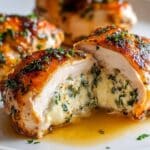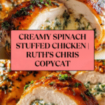 This Irresistible Ruth’s Chris Stuffed Chicken Copycat Recipe features juicy chicken breasts stuffed with a creamy blend of spinach, mozzarella, and seasoned cream cheese. The chicken is seared to golden perfection then baked with a flavorful broth and lemon juice, finished with a sprinkle of Parmesan for an elegant and delicious meal.