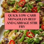 This Low-Carb Mongolian Ground Beef and Cabbage recipe offers a flavorful, nutritious meal that’s perfect for those following a low-carb diet. Featuring tender ground beef and sautéed cabbage bathed in a savory-sweet sauce enhanced with garlic, ginger, and soy, this dish is quick to prepare and packed with wholesome ingredients. It’s a delicious, satisfying choice for lunch or dinner with an Asian-inspired twist.