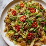 - Finish Cooking: Uncover the skillet and stir in the sliced green onions. Season with salt, pepper, and red pepper flakes if using. Continue cooking uncovered for another 2-3 minutes until the cabbage is tender and the sauce has thickened slightly.