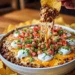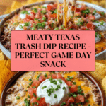 Meaty Texas Trash Dip is a rich and flavorful layered dip that combines seasoned ground beef, creamy cheese, refried beans, and diced tomatoes with green chilies. Baked to bubbly perfection and topped with cheddar cheese and green onions, it’s a perfect party appetizer served warm with crunchy tortilla chips.