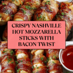 These Nashville Hot Mozzarella Sticks with a Crispy Bacon Twist are a spicy, cheesy appetizer perfect for fans of bold flavors. Wrapped in thin-cut bacon and coated with a flavorful Nashville-style hot sauce, these sticks can be baked or air-fried to crispy, melty perfection. Serve them fresh with ranch or blue cheese dressing for dipping.