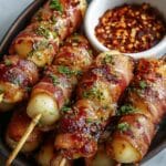 These Nashville Hot Mozzarella Sticks with a Crispy Bacon Twist are a spicy, cheesy appetizer perfect for fans of bold flavors. Wrapped in thin-cut bacon and coated with a flavorful Nashville-style hot sauce, these sticks can be baked or air-fried to crispy, melty perfection. Serve them fresh with ranch or blue cheese dressing for dipping.