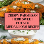 Crispy and flavorful Parmesan Herb Sweet Potato Medallions baked to golden perfection with a zesty lemon-herb Parmesan coating. These tender sweet potato rounds are lightly coated in olive oil, dipped in a fragrant mix of Parmesan, rosemary, thyme, parsley, sea salt, pepper, and lemon zest, then oven baked for a deliciously crisp and creamy side dish.
