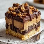 - Layer the Peanut Butter Mixture: Pour the prepared peanut butter mixture evenly into the bottom of the greased baking dish, spreading it out to form an even base layer.