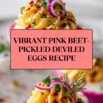 This Perfectly Pink Deviled Egg recipe features eggs beautifully pickled in a vibrant red beet brine, offering a visually stunning twist on a classic appetizer. The eggs are boiled and gently peeled, then soaked in a flavorful beetroot pickle for 2 to 4 hours, imparting a beautiful pink hue and subtle tangy flavor. The creamy yolk filling is a luscious blend of lemon juice or dill pickle juice, Dijon mustard, cold butter, and mayo, whipped until light and fluffy. Garnished with crispy bacon, fresh herbs, and pickled vegetables, these deviled eggs are both elegant and delicious, perfect for parties or special occasions.