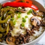 This Philly Cheesesteak Bowls recipe offers a delicious low-carb, high-protein dinner option featuring thinly sliced ribeye or sirloin steak cooked with sautéed onions and bell peppers, topped with melted provolone or mozzarella cheese. Served over cauliflower rice, mashed potatoes, or regular rice, this dish combines classic comfort flavors with a healthy twist.