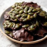 Store the Pumpkin Seed Chocolate Bites in an airtight container in the refrigerator for up to one week. They can also be frozen for longer storage. Allow frozen bites to thaw at room temperature before serving. Reheat briefly if you prefer the chocolate slightly softened.