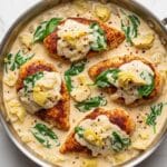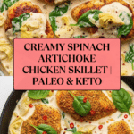 This Spinach Artichoke Chicken Skillet is a rich and flavorful dish that fits perfectly into Paleo, Whole30, and Keto lifestyles. Tender chicken breasts are cooked in a creamy, garlicky sauce packed with spinach and artichokes, making it a comforting yet healthy meal for any night.