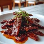 - Garnish and Serve: Sprinkle the beef strips with toasted sesame seeds and chopped green onions. Serve immediately for the best taste and texture.