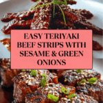 These Teriyaki Marinated Beef Strips are tender, flavorful, and perfect for a quick dinner. Coated in a sweet and savory glaze with a hint of spice, they make a delicious meal served over rice or noodles. The toasted sesame seeds and green onions add a lovely crunch and freshness to every bite.