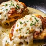 This Texas Roadhouse Smothered Chicken recipe features tender, seared chicken breasts smothered in a creamy garlic sauce topped with melted Jack cheese. Perfectly baked to melt the cheese and finish the cooking, it’s a comforting and flavorful dish garnished with fresh green onions and a touch of paprika.