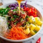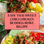 These Thai Sweet Chili Chicken Buddha Bowls offer a vibrant, flavorful combination of juicy sweet chili chicken, fresh pineapple, and a variety of crunchy vegetables atop a nutritious quinoa base. This easy-to-make, well-balanced meal is perfect for meal prep, featuring a delightful balance of sweet, spicy, and tangy flavors with a satisfying texture that’s both healthy and delicious.