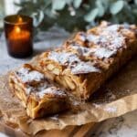 A sliced apple strudel rests on crinkled parchment paper over a wooden board, the strudel’s golden brown, flaky pastry crust layered thickly with cooked apple slices visible through cracks. The top is covered with thin, crispy folded layers and lightly dusted with powdered sugar, giving a soft white contrast to the warm caramelized brown of the pastry. One slice is slightly separated from the main piece to show the dense texture. In the background, a small dark brown candle glows warmly against green eucalyptus leaves, all set on a white marbled surface. photo taken with an iphone --ar 4:5 --v 7